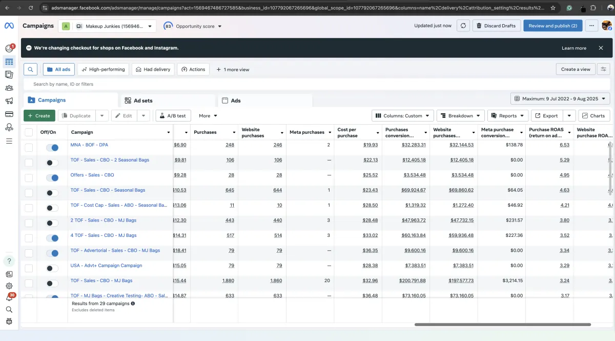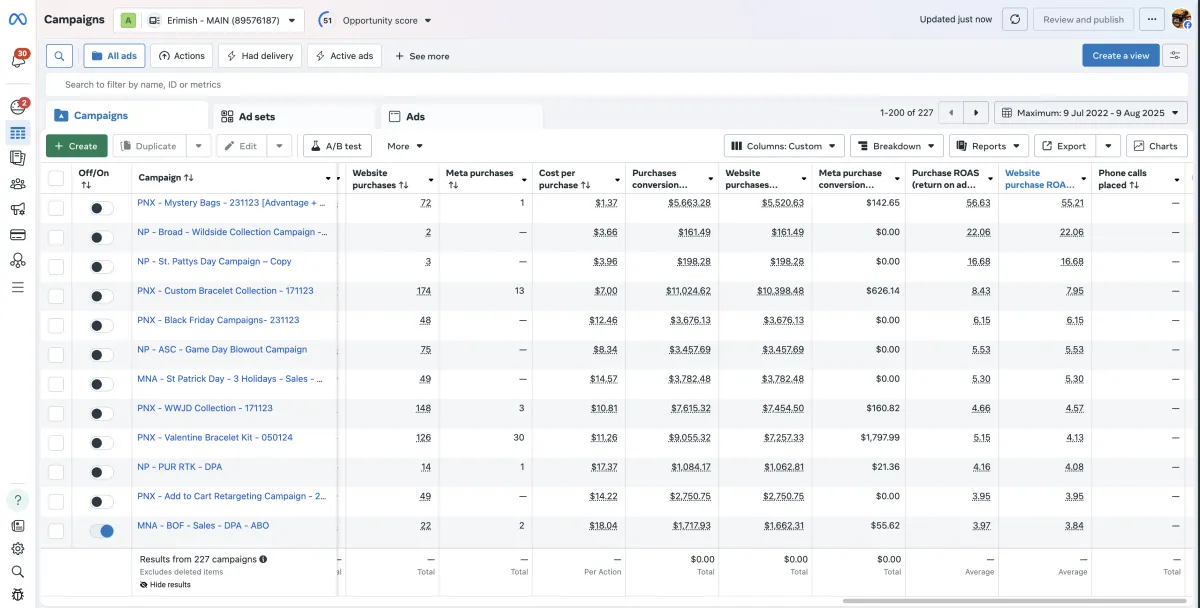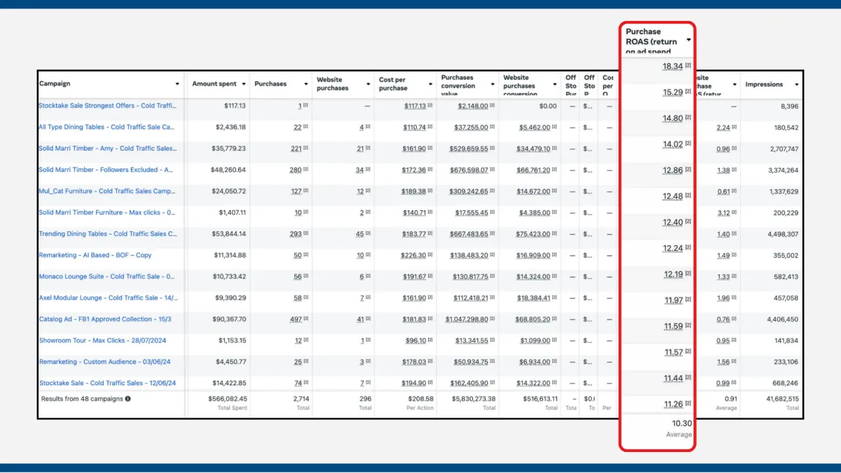 ROAS: 10.3 average across 48 Meta campaigns, with top performers hitting 18.34 ROAS