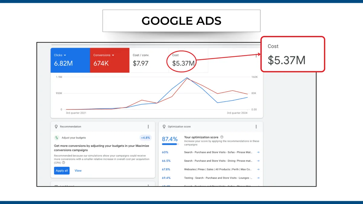 Ad Spend Managed: $566,082 (Meta) + $5.37M (Google Ads)